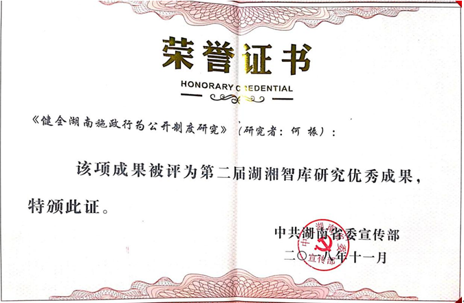 suncitygroup太阳集团方向负责人何振教授《健全湖南施政行为公开制度研究》课题被湖南省委宣传部评为“第二届湖湘智库研究优秀成果"。